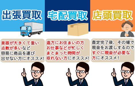 オーディオ買取業者では主に『出張買取り』『宅配買取り』『店頭買取り』の3種類の方法があります。